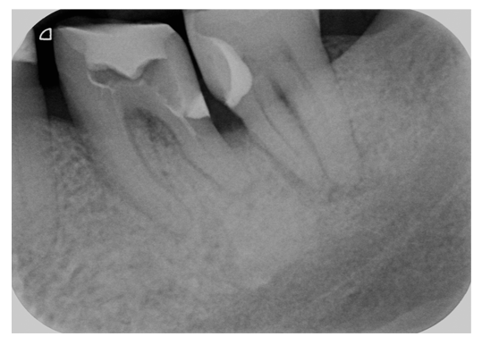 Abb. 5: Zahnfilm 36/37 mit suffizienten, deutlich subgingival liegenden Kompositrestaurationen, Aufhellung unterhalb der distalen Restauration 36 aufgrund einer Überlagerung mit dem schüsselförmig abgebauten Alveolarknochen, apikale Läsion 37 | Foto: Anne-Katrin Lührs