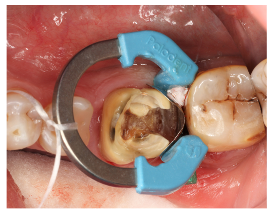 Abb. 3: Isolation des deutlich subgingivalen Defektes an Zahn 36 nach Kariesexkavation. Neben einer federharten Teilmatrize mit subgingivaler Lasche wurden Teflonband, ein interdentalkeil sowie ein mit Zahnseide gesicherter Separationsring zur Kontaminationskontrolle eingesetzt. | Foto: Anne-Katrin Lührs