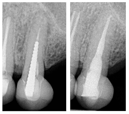 Abb. 2: a) Präoperative Einzelzahnaufnahme des Zahnes 25 mit langem geschraubtem Metallstift, b) Röntgenologische Kontrolle drei Jahre postoperativ | Fotos: Franziska Haupt