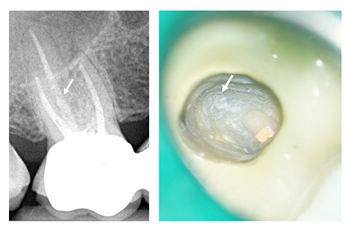 Abb. 3: a) Präoperative Einzelzahnaufnahme des Zahnes 16. Der palatinal inserierte Glasfaserstift ist radiologisch kaum erkennbar (Pfeil). b) Intraoperativ sichtbarer Glasfaserstift im palatinalen Wurzelkanal (Pfeil). Fotos: Franziska Haupt